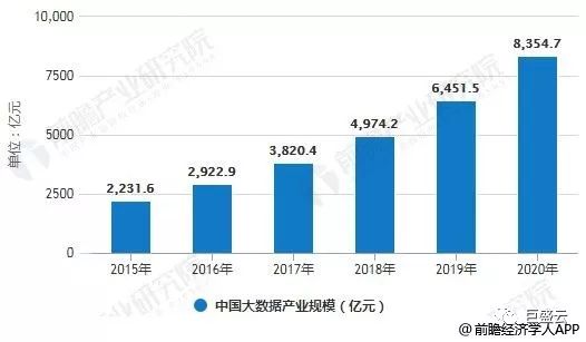 據前瞻產業研究院發布的《大數據產業發展前景與投資戰略規劃分析報告》統計數據顯示,截止到2017年中國大數據產業規模為3820.4億元。預計2018年中國大數據產業規模將達4974.2億元。隨著智慧城市、數字經濟、新舊動能轉換、轉型升級等概念持續引領產業增長,預計到了2020年中國大數據產業規模將超8000億元,達到了8354.7億元。